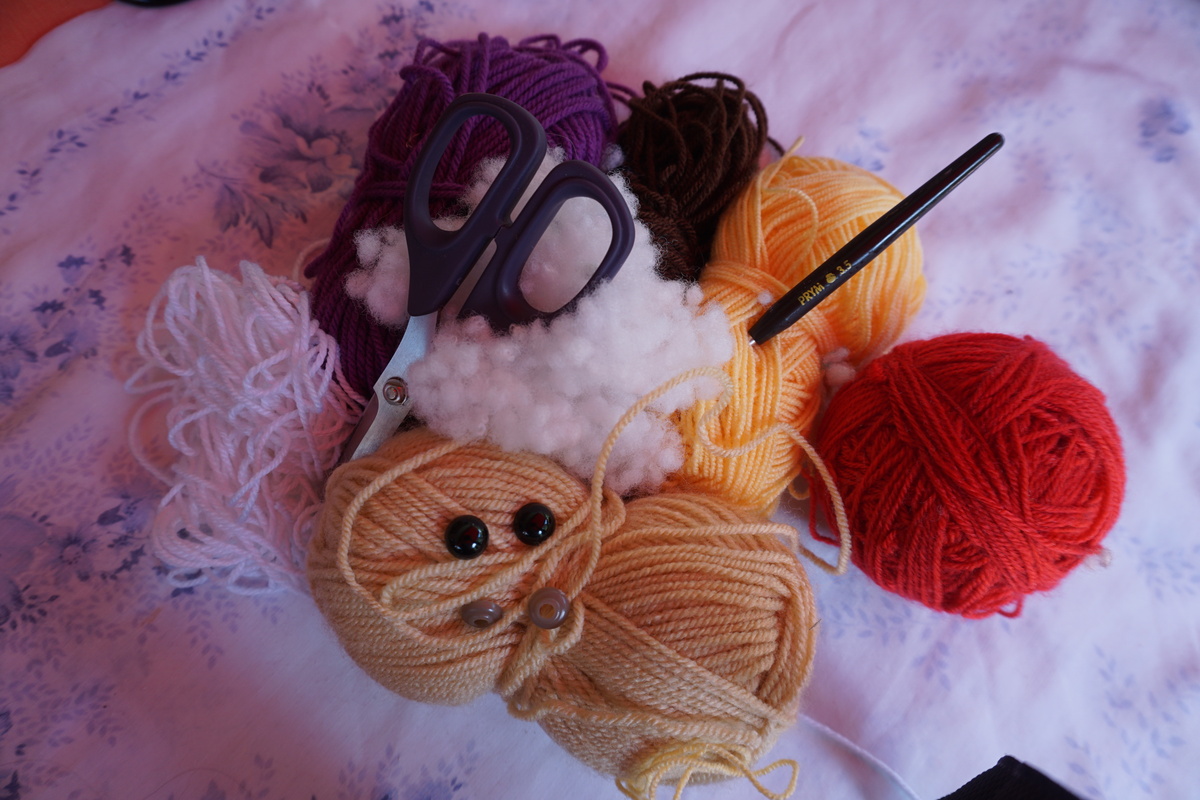 Du benötigst Wolle in den Farben : lila, weiß,braun, grün, rot, hautfarbe,und gelb.