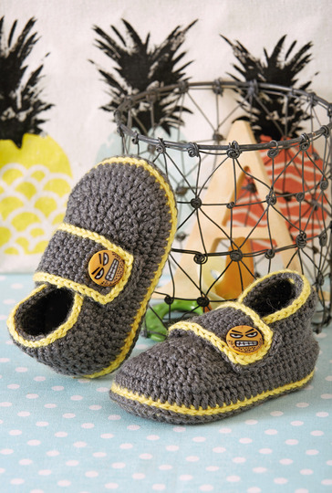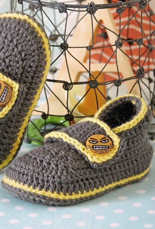 Diese Babyschühchen werden nur an den Tagen angezogen, bei denen schon am Morgen nichts so richtig klappen will und die Laune nur noch besser werden kann. Das Gelb an den Rändern bringt schon etwas Licht in den grauen Alltag beziehungsweise in das graue Schühchen. Sowohl die doppelt gearbeitete Sohle wie auch die Oberseite werden mit festen Maschen und Stäbchen gehäkelt, sind also relativ leicht herzustellen. Die Lasche mit dem Knopfloch wird extra gehäkelt und dann an die Schühchen genäht. Sie machen das Schühchen perfekt. Und am Abend erinnern nur noch die grantigen Smily-Knöpfe an den verkorksten Morgen.Die Anleitung gilt für die Größe 17, das entspricht einer Fußlänge von 10 cm. Mit etwas dickerer Wolle und Nadeln können die "Grantler" auch für größere Größen gearbeitet werden.