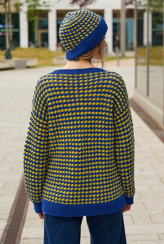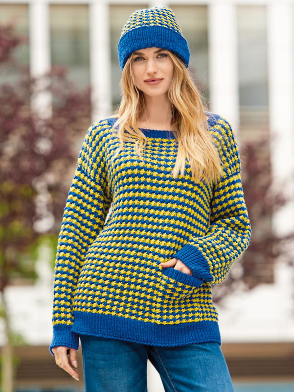 Blau und Gelb sind die Farben der Saison. Der bequem geschnittene Pulli und die dazu passende Mütze sehen sowohl zu Jeans als auch zum langen Rock gut aus. Das zweifarbige Sternmuster wird durch die Bündchen in Blau farbstark ergänzt. Die Bündchen beginnen mit einem Kreuzanschlag und werden dann in 1/1-Rippen gearbeitet. Der weite, runde Halsausschnitt hat ebenfalls eine blaue Rippenblende. Besonderes Gimmick ist die eingestrickte Tasche, die nur ein Mal vorhanden ist. Eine Anleitung gibt es für die Größen 38/40, 42/44 und 46/48 und für die Mütze mit 52–54 und 55–57 sowie 58–60 cm Kopfumfang.****