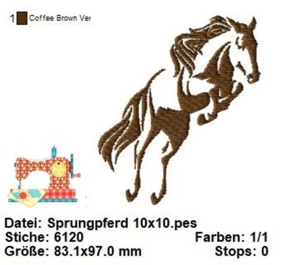 Die Stickdatei zeigt ein wunderschönes, stilisiertes Pferd, das sich gerade im Absprung befindet. Das Pferd ist elegant und kraftvoll dargestellt, mit fließenden Linien und dynamischen Bewegungen. Seine Muskeln sind deutlich sichtbar, während es sich mit Anmut und Leichtigkeit in die Luft erhebt.