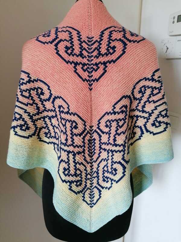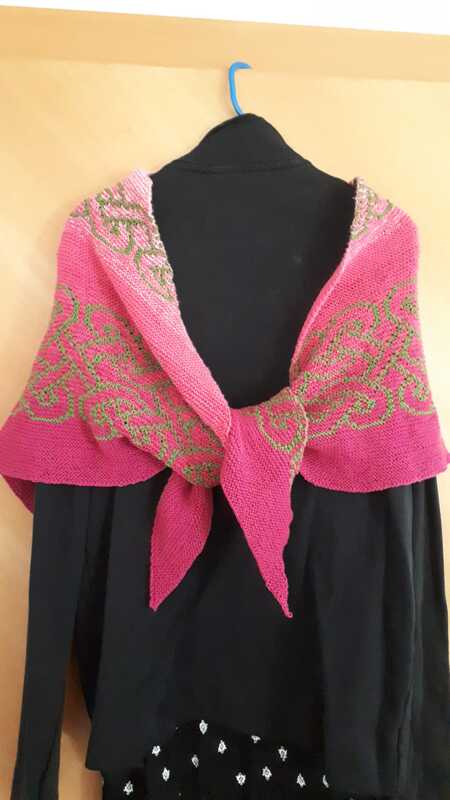Es ist ein gleichschenkeliges Dreieckstuch mit Hebemaschen Muster.