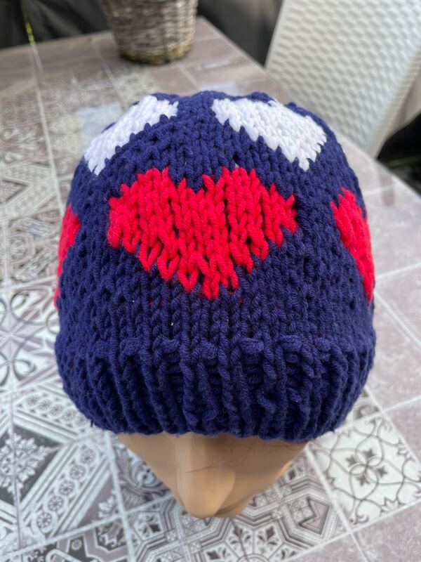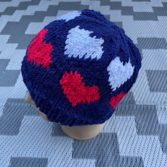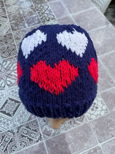 Mit zusätzlichen Maschen zwischen den Herzchen-Mustern kann die Mütze auch in einer größeren Größe gestrickt werden.