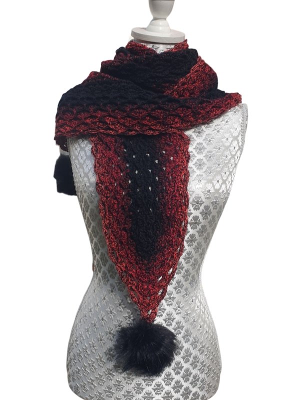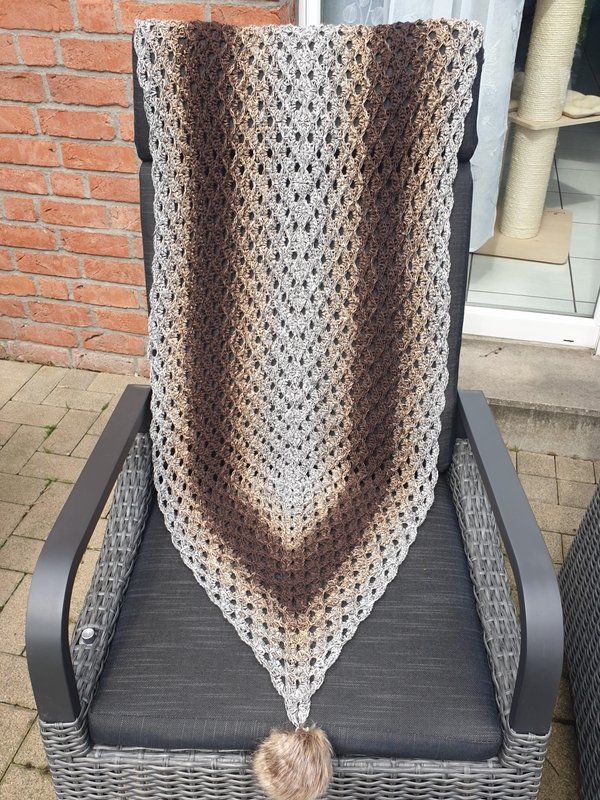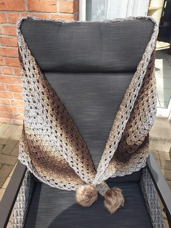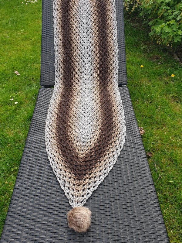 Diese ungewöhnliche Form mit 2 Spitzen ergibt sich daraus, dass Du in der Mitte des Schals beginnst, der Farbverlauf entwickelt sich dabei in beide Richtungen. Der von mir gerne verwendete Onschlag macht das möglich, da er hier von beiden Seiten behäkelt wird. An den Enden Deines Schals entstehen jeweils Spitzen, die ich mit Bommel (natürlich kein echtes Fell!) verziert habe.