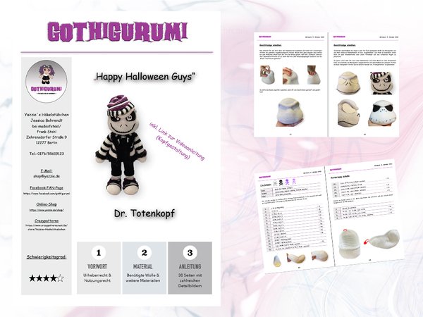 Es handelt sich hierbei um eine Anleitung, die bereits im Oktober 2022 hergestellt wurde. Die deutsche Originalausgabe dieser Anleitung erschien erstmals am 06.10.2023 unter dem Titel: „Happy Halloween Guys - Dr. Totenkopf“. Das Urheberrecht für diese Anleitung liegt bei Yazzie´s Häkelstübchen - Jessica Behrendt. Dies betrifft sowohl den Text, als auch die Fotos, Illustrationen und Zeichnungen. Verkauf, Vervielfältigung, Tausch und Veröffentlichung (inkl. Übersetzungen) der Anleitung (einschließlich Veröffentlichung im Internet) sind untersagt und stellen eine Urheberrechtsverletzung dar.
