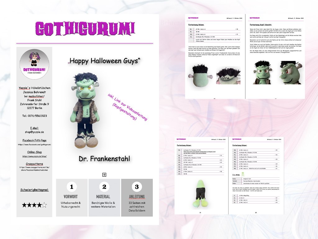 Es handelt sich hierbei um eine Anleitung, die bereits im Oktober 2022 hergestellt wurde. Die deutsche Originalausgabe dieser Anleitung erschien erstmals am 06.10.2023 unter dem Titel: „Happy Halloween Guys - Dr. Frankenstahl“. Das Urheberrecht für diese Anleitung liegt bei Yazzie´s Häkelstübchen - Jessica Behrendt. Dies betrifft sowohl den Text, als auch die Fotos, Illustrationen und Zeichnungen. Verkauf, Vervielfältigung, Tausch und Veröffentlichung (inkl. Übersetzungen) der Anleitung (einschließlich Veröffentlichung im Internet) sind untersagt und stellen eine Urheberrechtsverletzung dar.