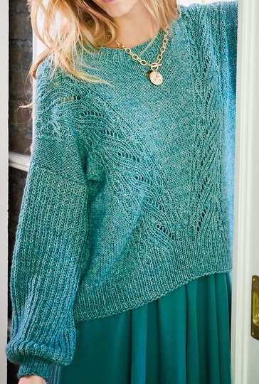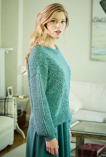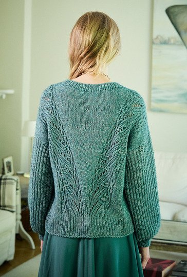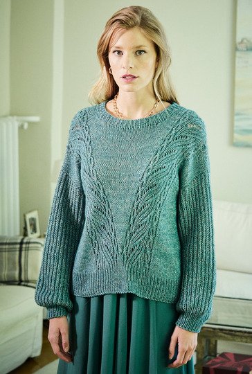 Ziemlich schräg: Der v-förmige Musterverlauf dieses Pullis sorgt für eine dezente Saumrundung und leichte Schulterschrägungen – ein innovativer Style, den es nicht von der Stange zu kaufen gibt. Ansonsten sind alle Teile ganz gerade gearbeitet, was auch das Einnähen der Ärmel enorm erleichtert. Lediglich der Halsausschnitt ist abgerundet. Das Ajourmuster für die Schrägstreifen ist nicht allzu schwer und nach ein paar Höhenrapporten kannst du ihn sicher auswendig. Edel und angenehm auf der Haut ist das Seide-Schurwolle-Mischgarn. Die Anleitung gibt es für Größe 36/38, 40/42 und 44/46.