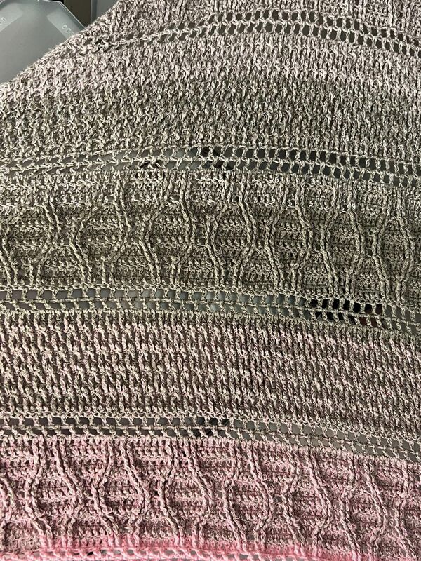 Das Tuch hat bei einem Verbrauch von 1100m mit 3 Fäden und Nadelstärke 3,5 eine Größe von 110x163cm erreicht. Das Tuch ist beliebig erweiterbar.