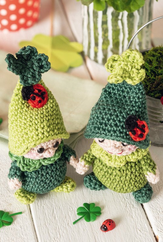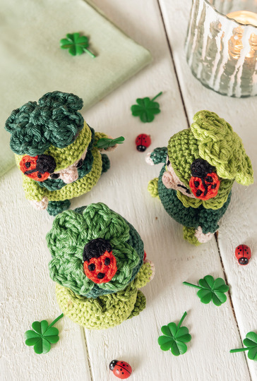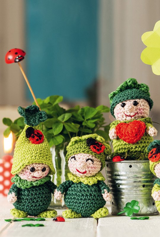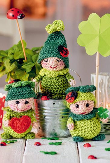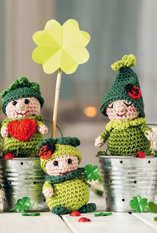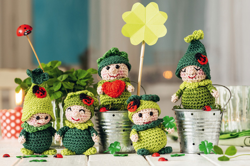 Es schadet nie, dem Glück ein wenig auf die Sprünge zu helfen, zum Beispiel mit diesen kleinen drolligen Glücksklee-Wichteln. Sie eignen sich perfekt als Geschenk zum Jahreswechsel für liebe Freunde oder sich selbst! Extratipp: Auf dem gefalteten Kleeblatt aus Papier lassen sich liebevolle Botschaften für die Beschenkten unterbringen – für doppeltes Glück. Die Wichtel werden mit festen Maschen nach der ausfühlichen Anleitung mit verschiedenen Baumwollgarnresten gehäkelt. Das ist auch für etwas ungeübtere Häklerinnen kein Problem. Die fünf Wichtel tragen verschiedene Mützenvarianten mit jeweils einem Marienkäfer als Schmuck.