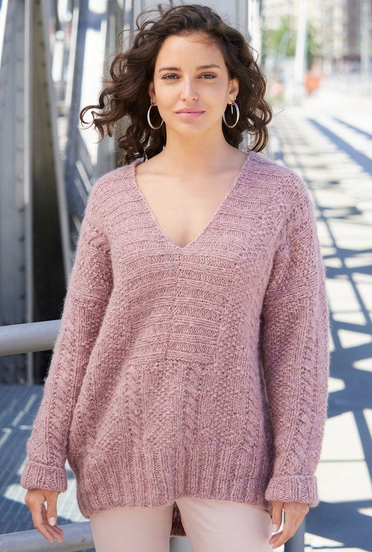 Gemütliche Oversize-Formen sind Silhouetten, die gerade in dieser Saison hoch im Kurs stehen. Hier aus einem kuscheligen Alpaka-Schurwollgarn in sanftem Rosenholz. Breite Bündchen aus 2/2-Rippen finden sich auch bei der V-Ausschnittblende, die im unteren Bereich des hohen V-Ausschnitts zusammengenäht wird, um nicht zu viele Einblicke zu gewähren. Das Grundmuster setzt sich zusammen aus Zöpfen und einem Strukturmuster mit rechten und linken Maschen. Weiches Alpaka-Schurwolle-Mischgarn in der angesagten Farbe Rosenholz, mit 7er-Nadeln gestrickt, fühlt sich wunderbar kuschelig an. Die Anleitung gibt es für die Größen 38/40 und 46/48.
