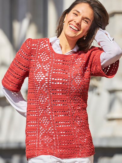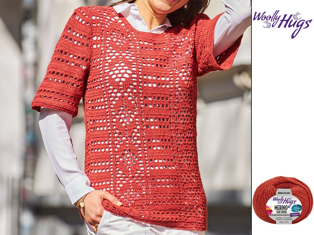 Dieser luftige Kurzarmpulli ist aus einem hochwertigen Garn aus Merinowolle und Seide gestrickt und hat ein wunderschönes Muster. Das Muster ist ein Mix aus Stäbchen und Luftmaschen, die sich perfekt ergänzen. Es ist sowohl elegant als auch verspielt und macht den Pulli zu einem besonderen Stück.