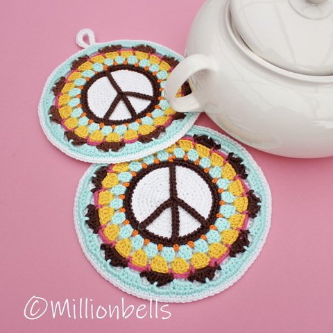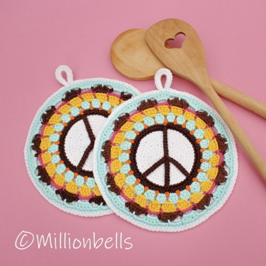 Mit einem schönen Satz Topflappen mit Friedenszeichen, wird das Halten heißer Töpfe zum Kinderspiel und macht Spaß! In dieser Anleitung wird beschrieben, wie man solchen Topflappen häkelt, wie in den Bildern gezeigt, hergestellt aus Baumwollgarn (5-fdg Sockenwollstärke) und Häkelnadel Größe 3 mm.