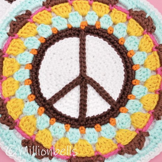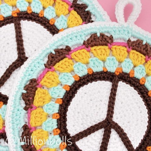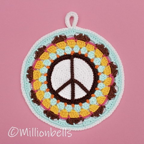 Diese praktischen Topflappen bestehen aus 2 separaten Teilen. Auf der Vorderseite befindet sich in der Mitte ein Friedenszeichen, gefolgt von Runden interessanter, unterschiedlicher Stiche in schönen leuchtenden Farben. Die Rückseite wird in durchgehenden Runden in Weiß gehäkelt. Vorder- und Rückseite sind rundum mit einer einfachen Häkel-Kante verbunden und mit einen Hängeschlaufe versehen.