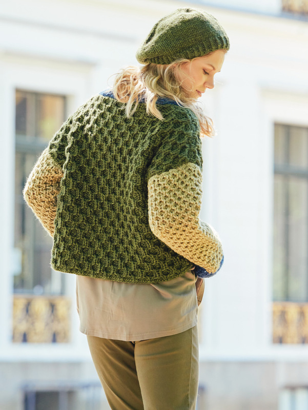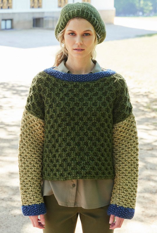 Mit Farben spielen – so heißt das Motto bei diesem Wabenmuster-Pulli, dessen Korpus und Ärmel in verschiedenen Waldtönen (Moos und Lindgrün) brillieren, wobei bei Vorder- und Rückenteil ein großes und bei den Ärmeln ein kleines Wabenmuster gearbeitet wird. Die Bündchen der Ärmel sowie die Ausschnittblende sind im kleinen Perlmuster in Kobaltblau gearbeitet, was einen frischen Effekt erzielt. Komplettiert wird das Set durch die Baskenmütze – und fertig ist ein Look mit Bestseller-Potenzial. Eine Anleitung für den Pulli in Größe 34/36 (38/40) 42/44 und für die Mütze mit 50 – 52 cm Umfang steht zum Download bereit.