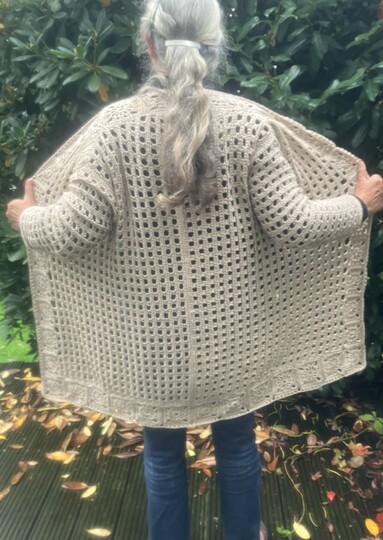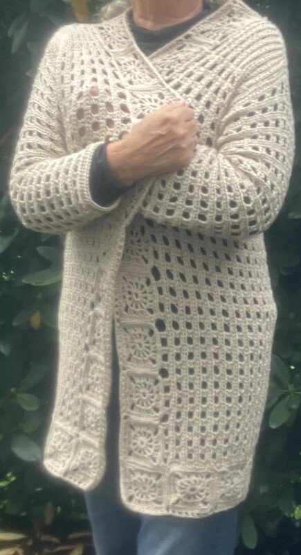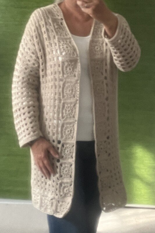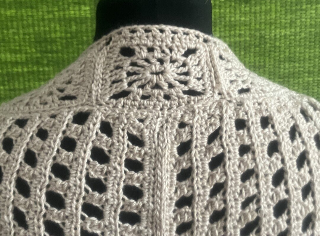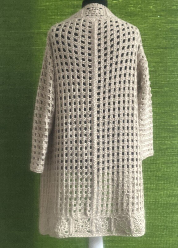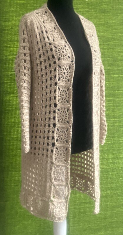 Diese Jacke ist mit relativ grober Wolle gehäkelt, mit Grannys rundherum verziert. Das Lochmuster ist mit verbundenen Stäbchen gehäkelt. Alles zusammen ein schöner Kontrast zwischen „Vintage“ und „Hip“.