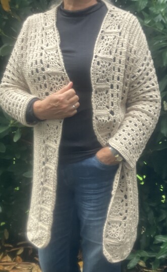 Du bekommst eine Anleitung (21 Seiten), mit vielen Fotos und Strichzeichnungen, die alles dokumentiert, was du brauchst, um erfolgreich diese Jacke zu häkeln. Sie ist quer gehäkelt, so dass du jederzeit die Breite überprüfen kannst und weiter häkeln kannst, wenn sie noch nicht passt. Alle Größen sind auf diese Weise machbar. Von S- XXXL. Die Länge der Jacke legst du ganz zu Anfang fest. Auch dabei ist alles möglich: von kurz bis wadenlang. Auch das wird erklärt. Es kann nicht schief gehen, denn zunächst häkelst du so viele Grannys, wie du für deine gewünschte Länge brauchst, fügst sie aneinander, legst sie dir um und kannst so die Länge überprüfen.