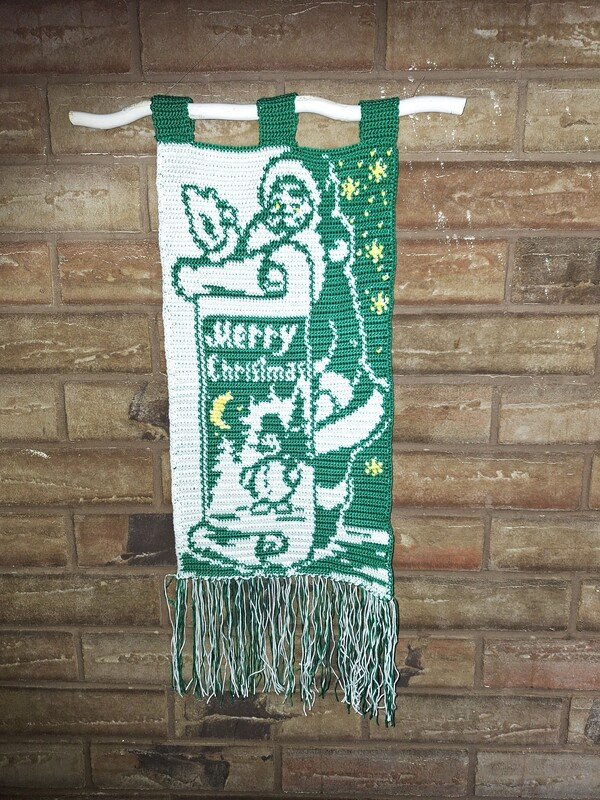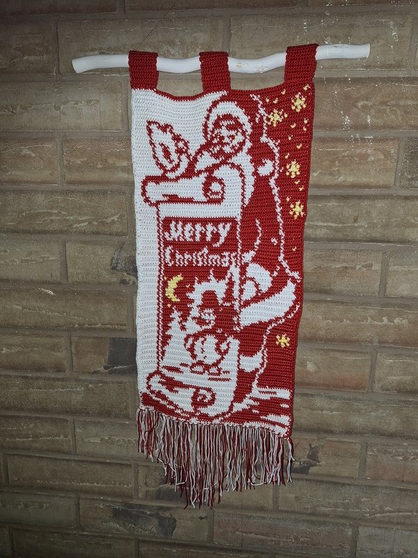 Mit einem freundlichen Gesicht und einem Weihnachtsgruß im Gepäck kommt dieser Wand- oder Türbehang daher.