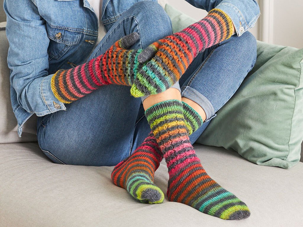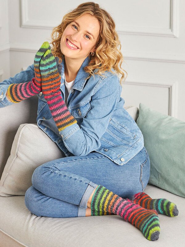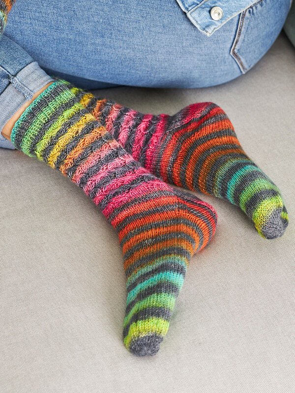 Hinweis: Jeder Knäuel hat in der Mitte eine farbliche Kennzeichnung und markiert so den Anfang der 2. Socke.