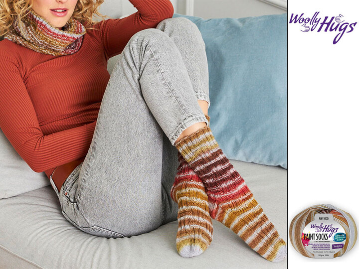 Mit dem Loop und den Socken kannst du ein bisschen Farbe in dein Leben bringen. Dieser Loop und die Socken sind das perfekte Accessoire für jeden Tag. Das Garn Woolly Hugs Paint Socks sorgt für gute Laune beim Verarbeiten. Denn es ist spannend zu sehen welche Farbe als nächstes kommt.