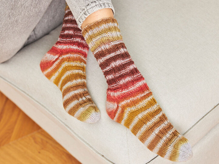 Hinweis: Jeder Knäuel hat in der Mitte eine farbliche Kennzeichnung und markiert so den Anfang der 2. Socke.