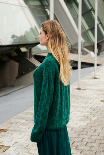 Ein bequem geschnittener Oversize-Pullover mit rundem Halsausschnitt und langen Ärmeln. Er wird überwiegend im Perlmuster gestrickt und im Mittelteil mit einem ausdrucksstarken Blattmuster, beidseitig begleitet von schmalen Zopfstreifen. Die Bündchen und die Halsausschnittblende werden im 1/1-Rippenmuster gearbeitet. Der Schnitt ist unkompliziert: gerade eingesetzte Ärmel und gerade Schulterabnahmen – deshalb fallen die Schultern leger über. Wir haben ein Mischgarn aus Alpaka und Baumwolle mit kleinem Schurwollanteil in dunklem Opalgrün verarbeitet. Eine Anleitung ist für die Größen 40/42, 44/46 und 48/50 vorhanden.