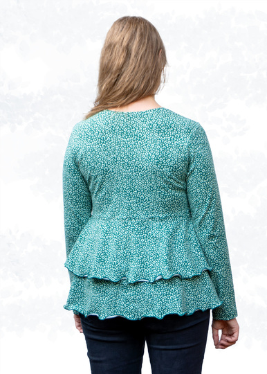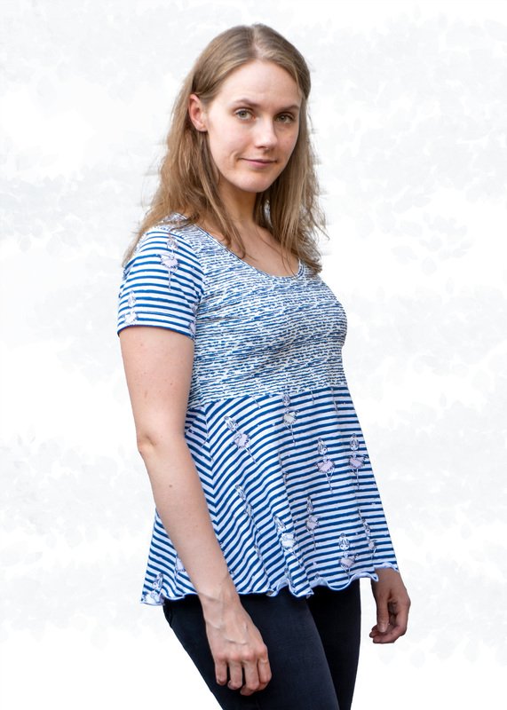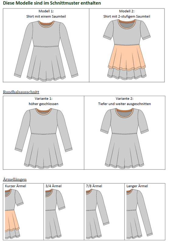 Das Modell “Leonie” ist ein Jerseyshirt mit einer Empire-Teilung und einem glockigen Saumteil. Das Saumteil kann entweder einlagig oder zweistufig gearbeitet werden.