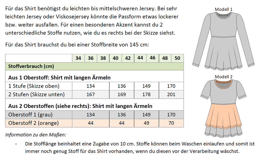 Für das Shirt benötigst du leichten bis mittelschweren Jersey. Bei sehr leichten Jersey oder Viskosejersey könnte die Passform etwas lockerer bzw. weiter ausfallen. Für einen besonderen Akzent kannst du 2 unterschiedliche Stoffe nutzen,.