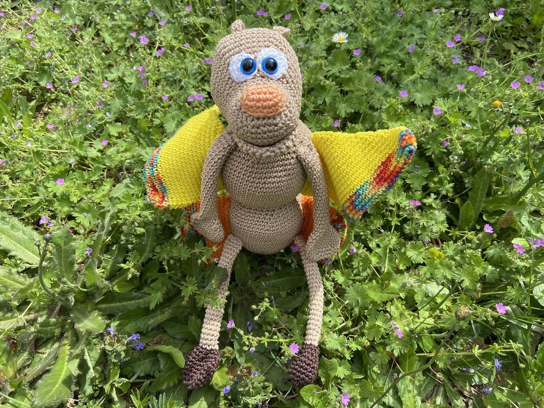 Gehäkelt mit dem angegebenen Material wird Babsi – von den Fühlern bis zu den Beinspitzen – ca. 38 cm groß.