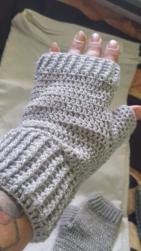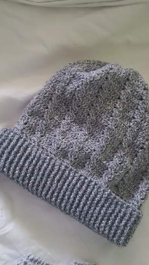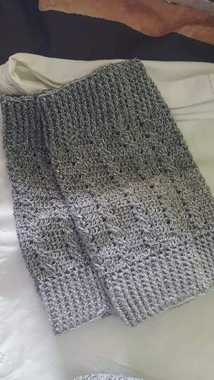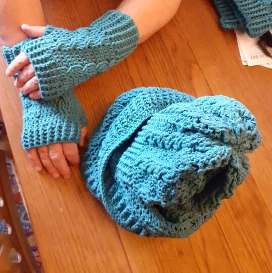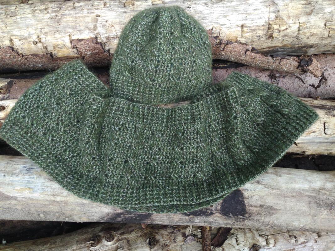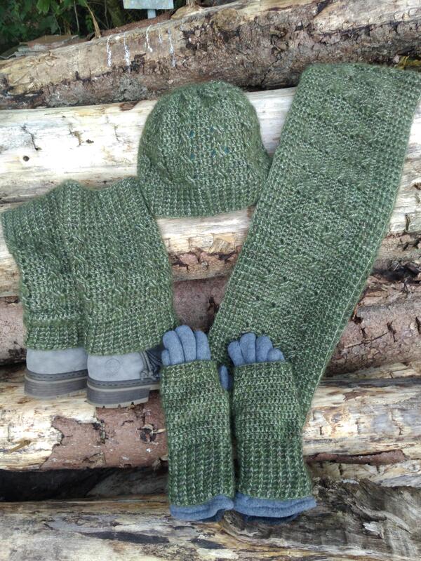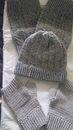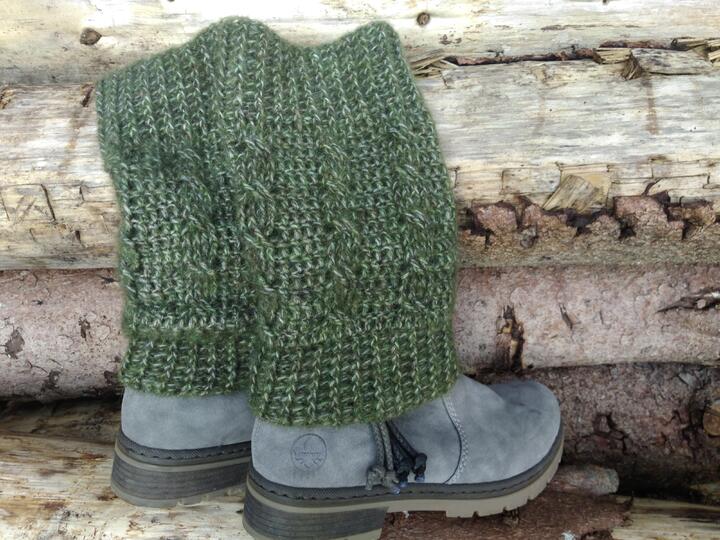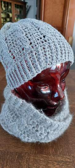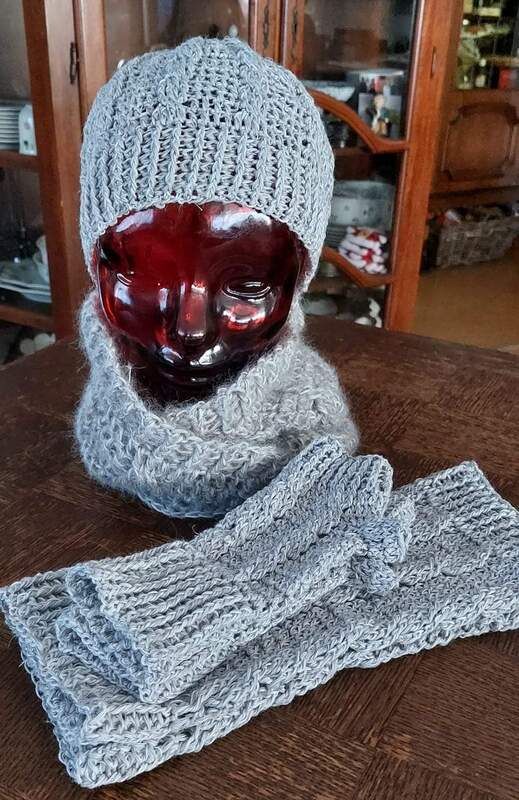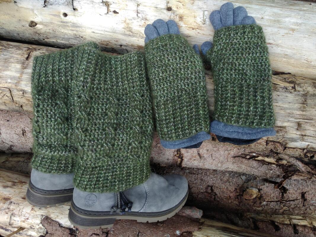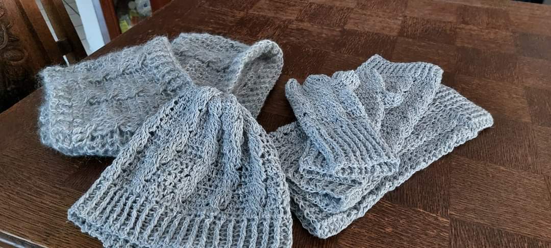 Mohair/Baumwolle mit NS 4,5: Loop 750 m, Mütze 250m, Handschuhe 2x 100 m, Beinstulpen 2x 200 m