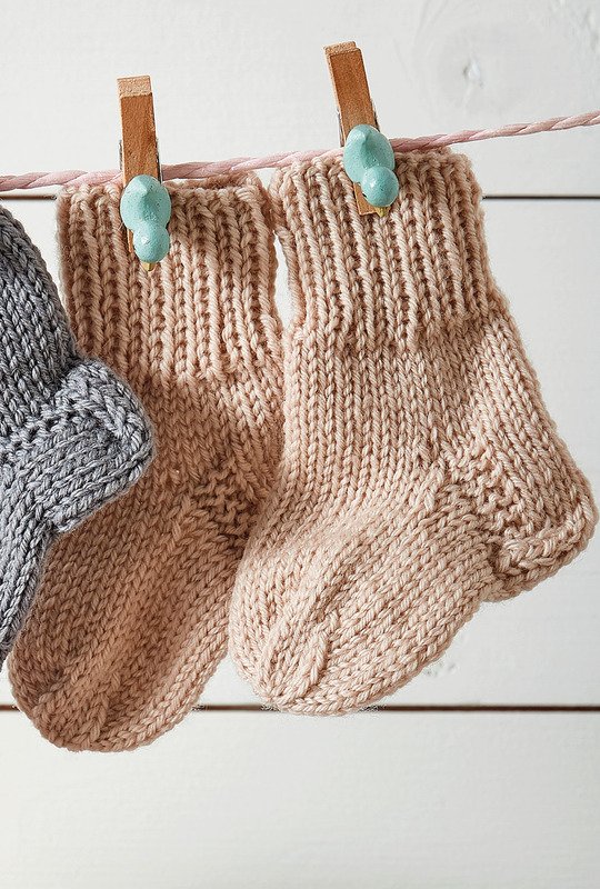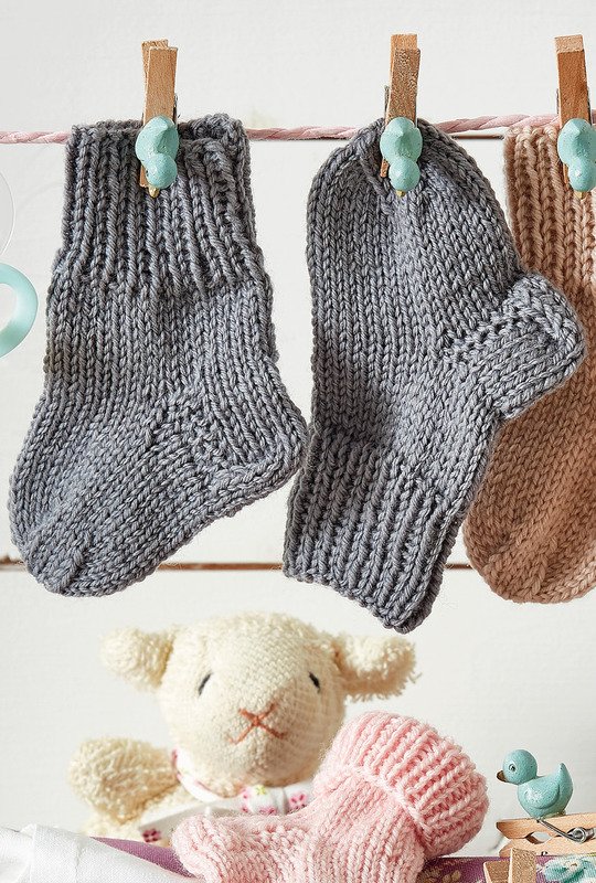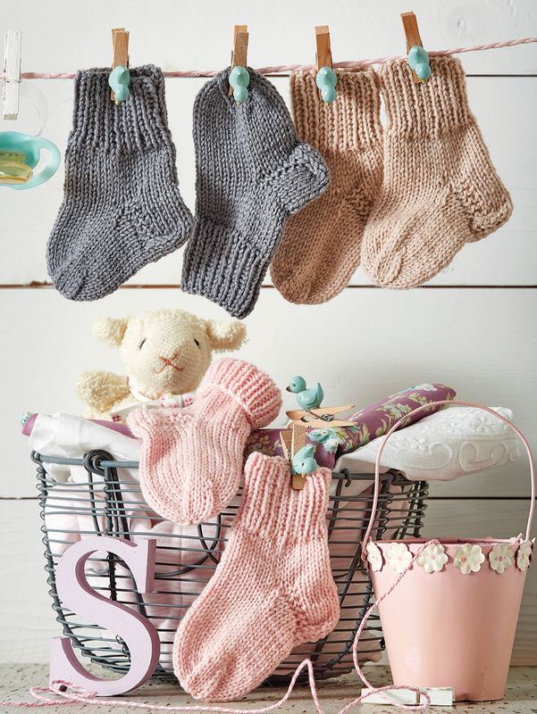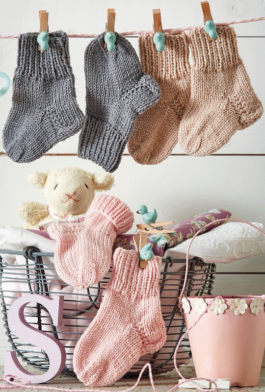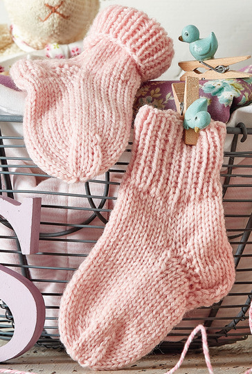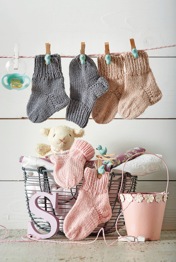 Die hübschen Babysöckchen für die ersten Lebensmonate sind schnell und leicht zu stricken. Der Schaft wird im Rippenmuster gefertigt, die Ferse und der Fuß glatt rechts, wobei die Ferse durch zwei kraus rechts gestrickte Maschen abgesetzt wird. Die Söckchen für die Größen 16/17 sind so schnell gestrickt, dass man sie gern in mehreren Farben wie Rosa, Grau oder Beige für jedes Baby-Outfit herstellt. Die Größen entsprechen einer Fußlänge von 9,3 - 10 cm. Das weiche Merinogarn gibt es bei Schoeller & Stahl. Es wird mit Nadelstärke 2 - 2,5 verstrickt.