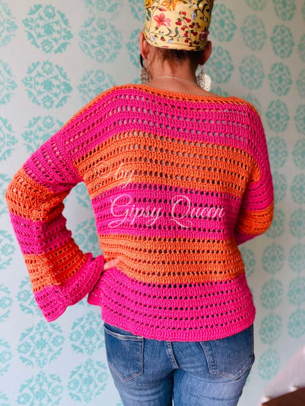 Der Pullover Tanja nach dieser Anleitung hat bei Größe 36/38 eine Länge von ca. 50 cm und eine Breite von ca. 50 cm, bei Größe 40/42: Länge ca. 60 cm und Breite ca. 52 cm.