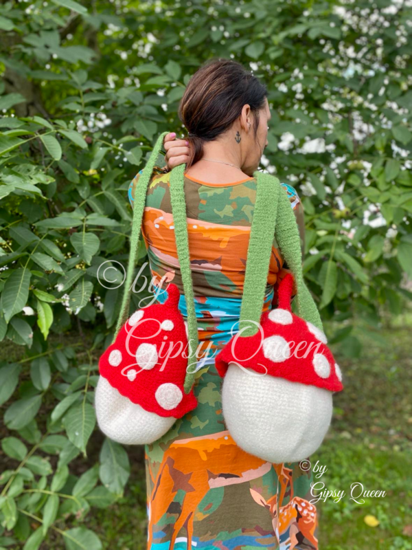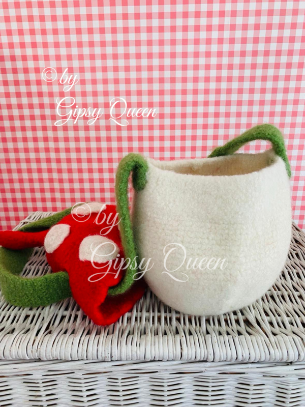 Die kleine Tasche hat eine Länge von ca. 18 cm und eine Breite von ca. 20 cm, der Pilzdeckel hat eine Länge von ca. 25 cm und eine Breite von ca. 27 cm.