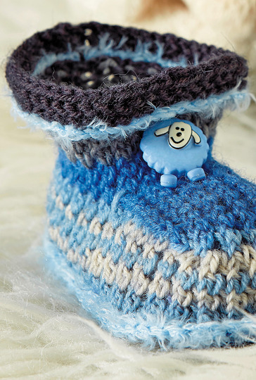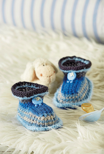 Mit diesen Schühchen ist der Schlaf der Babys vorprogrammiert. Warm und kuschelig umhüllen sie die Füße und die goldigen Knöpfe tragen ihren Teil zum wohligen Schlaf bei. Im Handumdrehen sind die Babyschühchen nach der Strickanleitung gefertigt und mit Flauschgarn am Sohlenrand sowie am Schaft verziert. Die kraus rechts gestrickte Sohle ist einfach herzustellen und das Strukturmuster auf der Schuhoberseite und am Schaft sieht einfach reizend aus. Das blau-graue Farbverlaufsgarn und die hellblauen Schaf-Knöpfe harmonieren in ihrer Ausstrahlung und wirken beruhigend. Und wenn Strick-Elastik in den Schaft eingearbeitet wird, können die Babyschühchen auch nicht mehr von den Füßen rutschen. Die Anleitung gilt für die Größe 20, das entspricht in etwa einer Fußlänge von 12 cm.