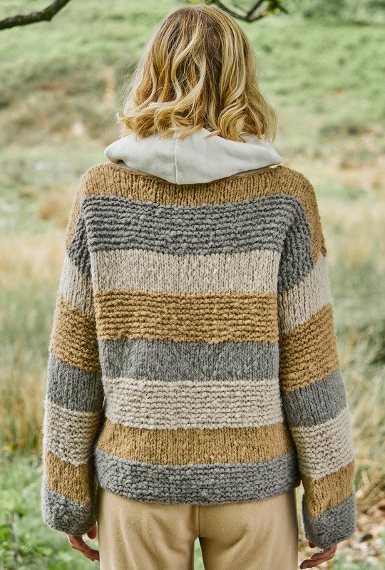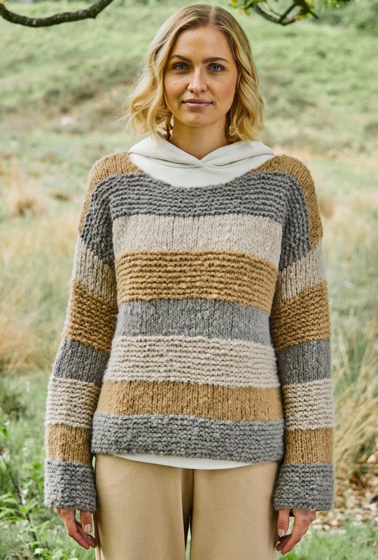 Mit seiner geraden Form ist dieser Pullover die ideale Wahl – auch Strickneulinge kommen mit diesem einfachem Blockstreifenmuster sicher ans Ziel. Das flauschige Garn, ermöglicht ein einfaches Strickerlebnis mit seinen Maschen glatt rechts oder kraus rechts gestrickt. Dieser Pulli bietet nicht nur einen perfekten Look, sondern ist auch äußerst lässig zu tragen und passt zu vielerlei Outfits. Die Kombination aus Einfachheit und Eleganz macht ihn zu einem vielseitigen Kleidungsstück, das in keiner Garderobe fehlen sollte.