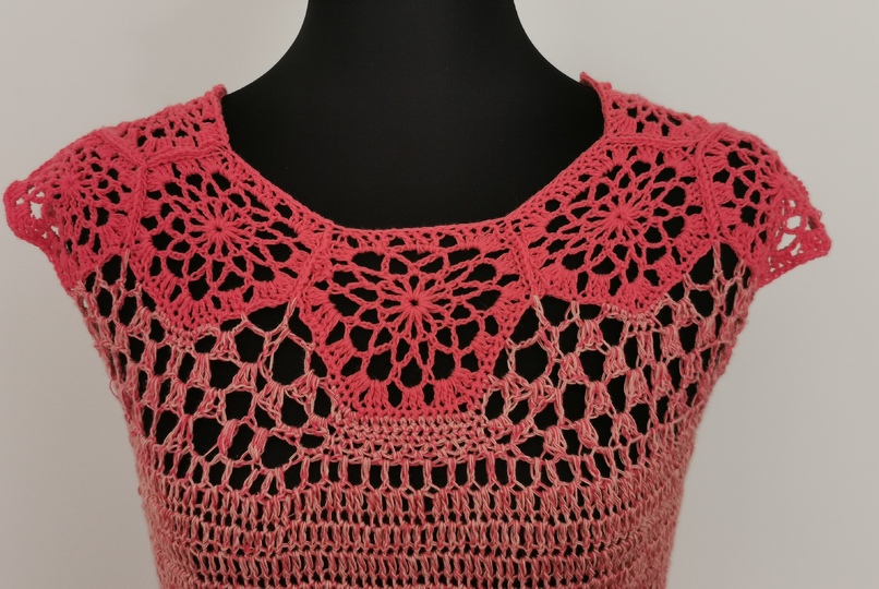 Irmgarion bietet viele Möglichkeiten, die Secksecke am Ausschnitt werden gehäkelt, der Rest kann entweder gestrickt oder in verschiedenen Variationen gehäkelt werden.