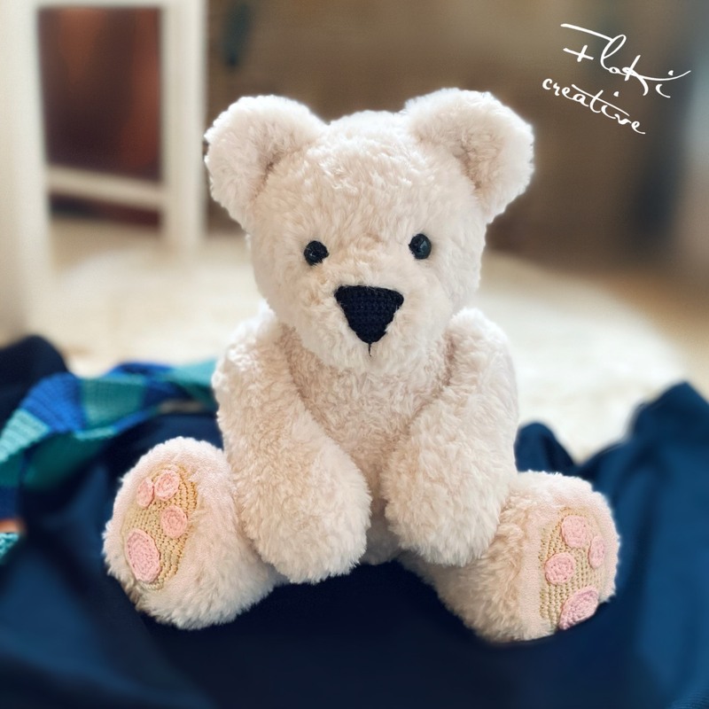 Der Eisbär ist, mit den angegebenen Materialien, 48 cm lang. Im Sitzen misst er 32cm und ist 900g schwer.