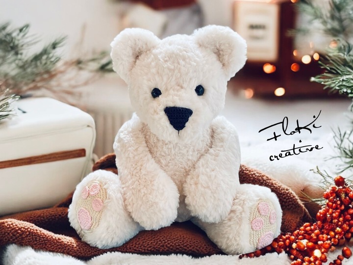 Der Eisbär ist, mit den angegebenen Materialien, 48 cm lang. Im Sitzen misst er 32cm und ist 900g schwer.