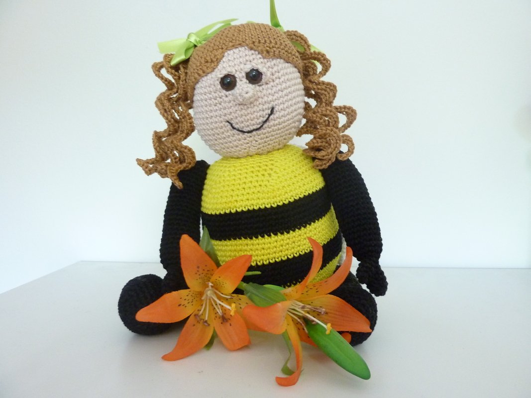 Holly Hummel wird, unter Verwendung des angegebenen Materials, sitzend 24 cm groß. Ich persönlich empfehle für das Nacharbeiten all meiner Amigurumis und Kuscheltiere Baumwollgarn.
