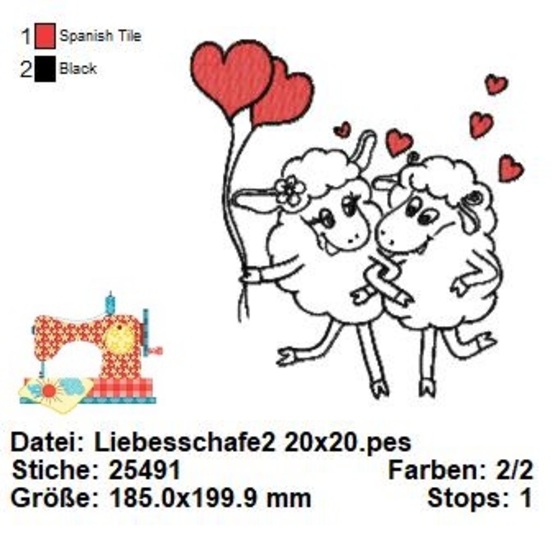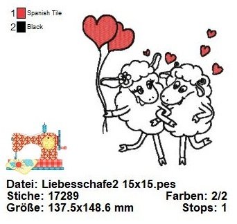 Diese Stickdatei ist wie ein süßes Liebesmärchen im Comic-Stil! Die beiden verliebten Schäfchen, die sich zärtlich ansehen, sind einfach entzückend. Sie halten herzförmige Luftballons, die ihre Liebe in die Lüfte steigen lassen.