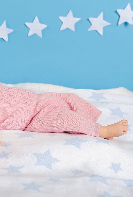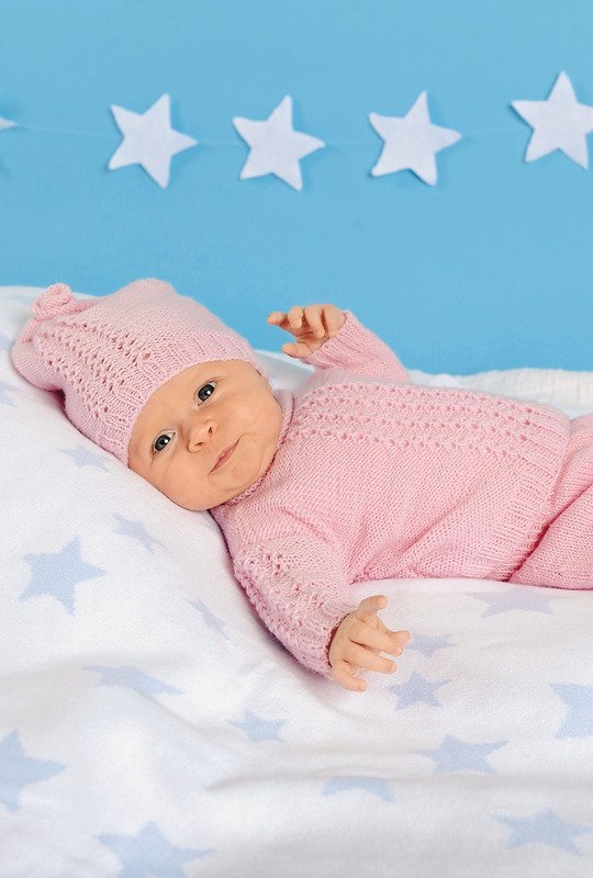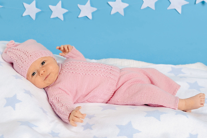 Eine fesche Kombi für Rosa-LiebhaberInnen (geht natürlich auch in jeder anderen Farbe). Die schmalen Lochmuster-Streifen zwischen den glatt links gestrickten Seiten sind recht einfach zu stricken, sodass jede/r sie mit etwas Erfahrung im Stricken meistern kann. Die Bündchen werden in 2/2-Rippen gestrickt. Putzig sieht der schmale, glatt rechts gestrickte Rollrand am Halsausschnitt aus. Dazu gibt es eine kurze Hose in glatt rechts und ein passendes Mützchen im Muster des Pullis. Eine Anleitung steht in den Größen 56 – 62, 68 – 74 und 80 – 86 zur Verfügung.