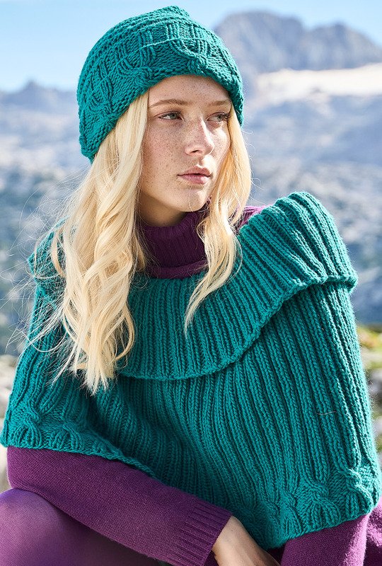 Eine Zopblende für den Abschluss, den Rest in Längsrippen – so einfach strickt sich das kurze Cape, durch dessen oberen Rand ein Hutgummi zur Stabilisierung gezogen und zum Schluss nach außen umgeschlagen wird. Das gleiche Spiel bei der passenden Mütze: Auch hier beginnt man mit der Zopfblende und setzt die Arbeit mit Querrippen fort. Ein selbstgemachter Pompon bildet den kessen Abschluss. Beide Teile garantieren durch das luxuriöse Kaschmirgarn bei Minunsgraden Wärme und Behaglichkeit.