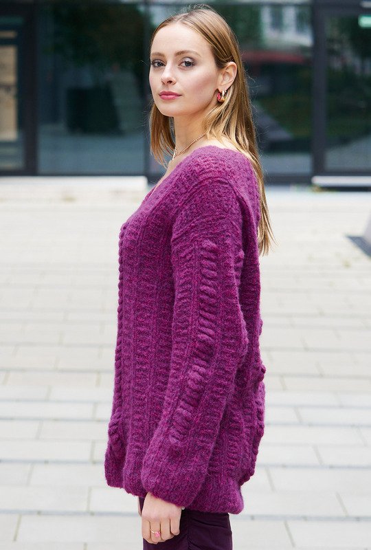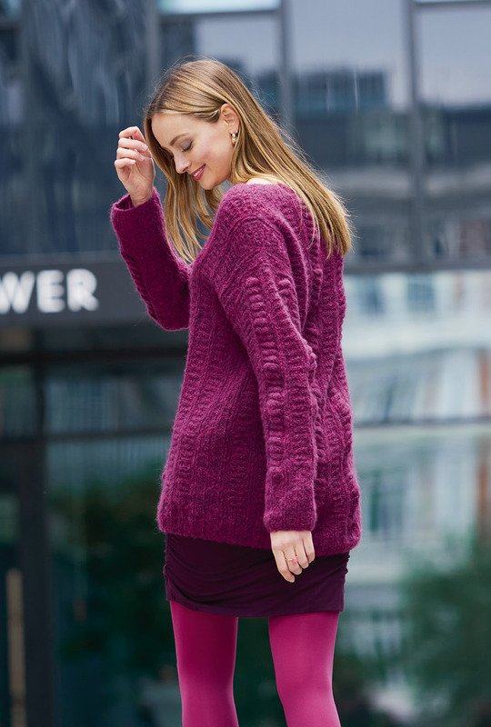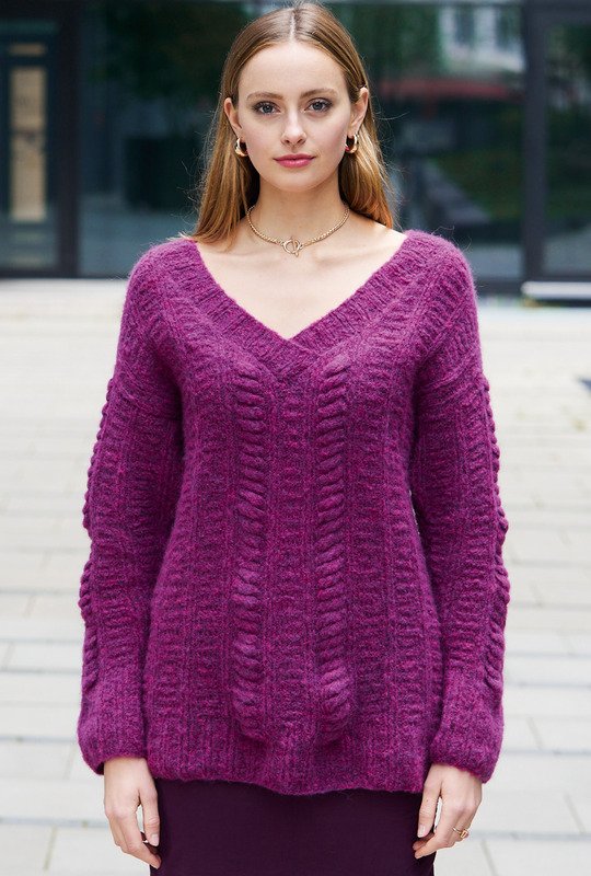 In diesem Modell sorgen Querrippen und Zopfstreifen für eine faszinierende Maschenoptik, die einen aparten Pullover mit einem tiefen V-Ausschnitt entstehen lässt. Diese Kombination aus verschiedenen Strickmustern verleiht dem Pullover nicht nur eine einzigartige Textur, sondern auch eine ansprechende visuelle Vielfalt. Die Längsstreifen des Pullis haben einen schmeichelnden Effekt und machen das stilvolle Kleidungsstück äußerst praktisch und bequem. Sein dickes Strickgarn sorgt für Wärme und Gemütlichkeit, was ihn zu einer idealen Wahl für kühle Herbst- und Wintertage macht.