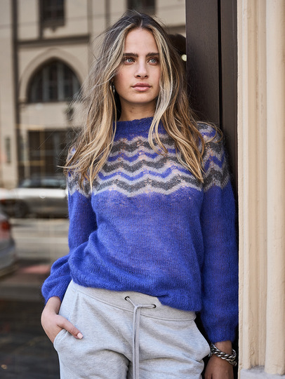 Bei diesem Rundpassen-Pullover geht es mehr um Schimmer und Shine als um Prunk und Protz. Denn der untere Bereich entsteht glatt rechts aus royalblauem Mohairgarn, das ist seiner Feinheit leicht transparent wirkt. Auf Brusthöhe fügen sich alle Maschen zur Rundpasse zusammen, die sich im gestreiften Zackenmuster mit Silber, Grau und dezentem Paillettenglanz präsentiert. Elastische Rippenbündchen und -blenden bilden das perfekt Finish und halten alles schön in Form.