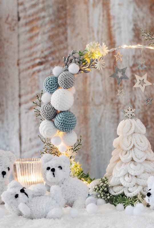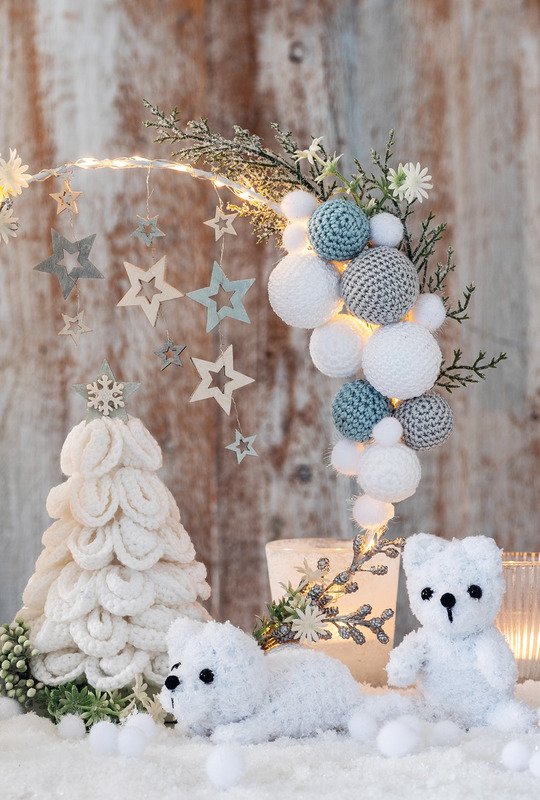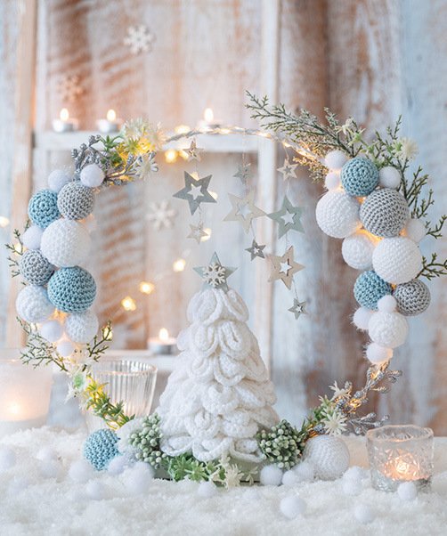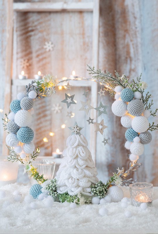 Komplett wird die romantische Winterszene mit dem Deko-Leuchtring mit umhäkelten Styroporkugeln in Weiß, Silber und Reseda sowie der verschneiten Tanne, deren Basis ein Styroporkegel ist und der rundherum mit den gehäkelten Tannenbaumschuppen beklebt wird. Dank der ausführlichen Anleitung lässt sich auch dieses Modell ohne Probleme nacharbeiten.