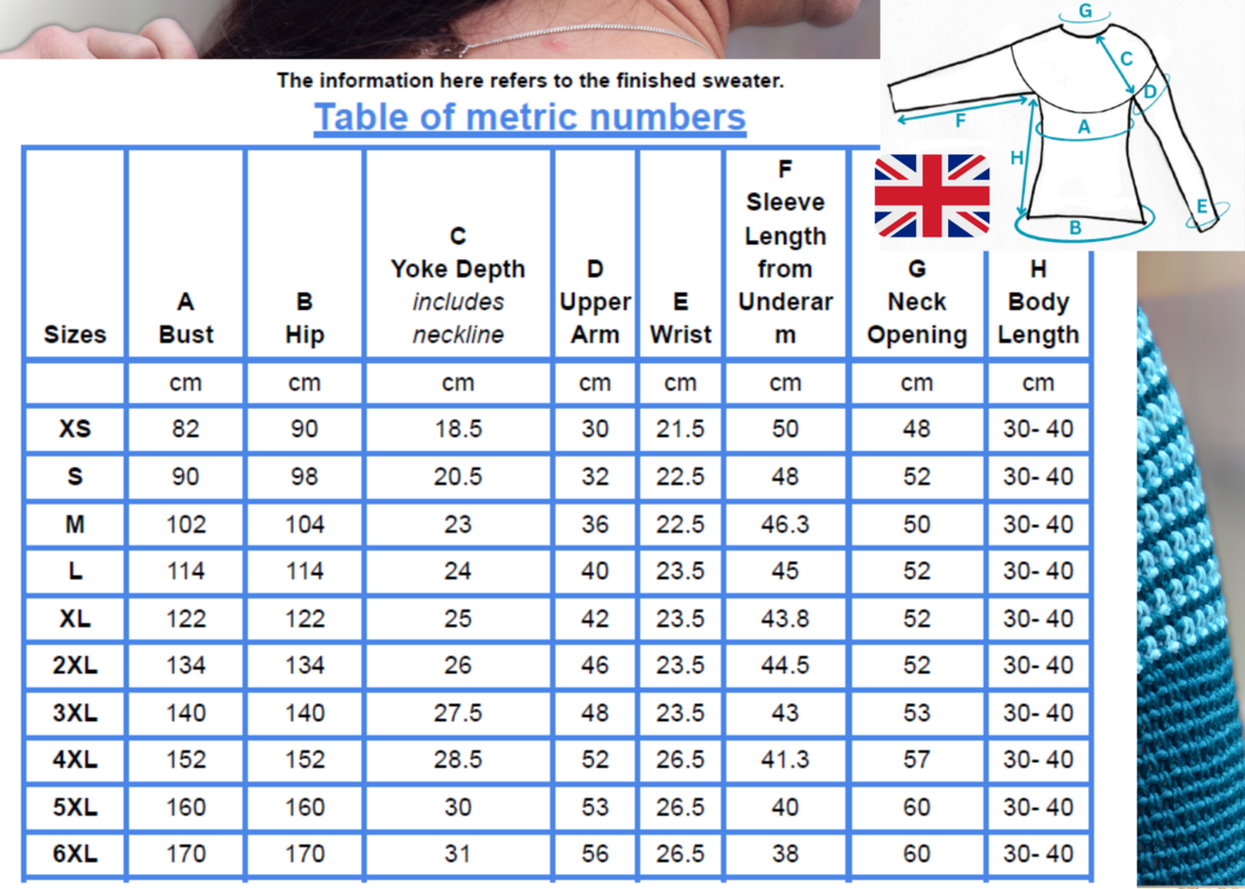 Es gibt eine Zeichnung mit dazugehöriger Tabelle. Diese enthält die Endmaße des Pullovers.