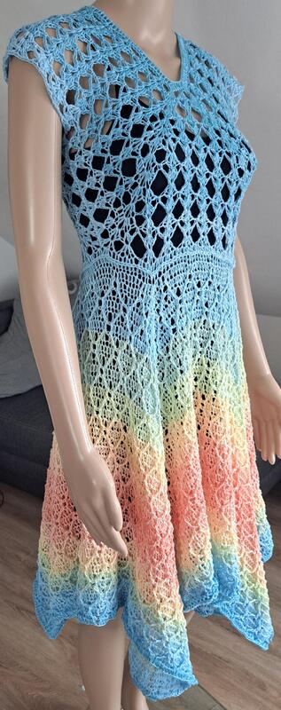 Das Kleid Kaila ist, aufgrund seiner Arbeitsweise, bestens für Farbverlaufsgarn geeignet.