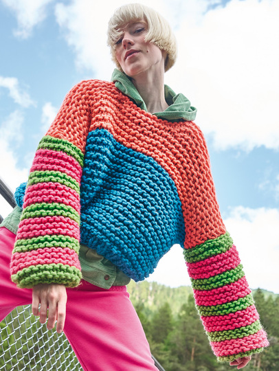 Geht es in diesem Winter ums Thema Warmhalten, haben Grobstrickgarne ihren ganz großen Auftritt. Mit Nadel Nummer 15 kommen die Kraus-rechts-Streifen dieses lässigen Pullis besonders plastisch zur Geltung. Leuchtende Farben wie Türkis, Pink, Grün und Koralle sind Stimmungsbooster, die wir jetzt gut brauchen können. Wir haben sie für den Korpus in breiten Flächen, für die Ärmel in schmalen Streifen angelegt. Schmale Rippenblenden aus dünneren Nadeln geben diesem Pulli die modische Boxy-Form.