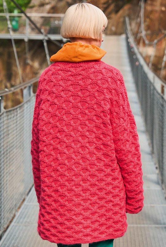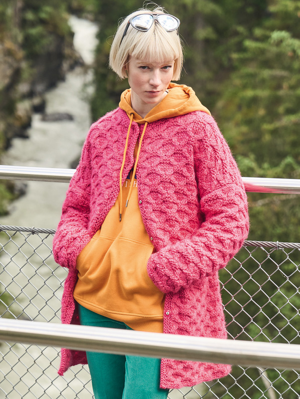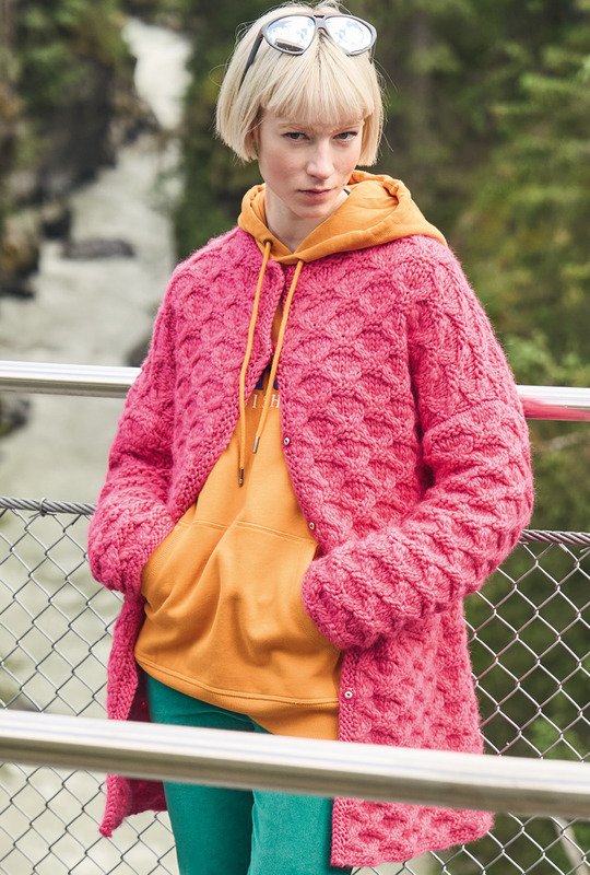 Im Sommer durch den Barbie-Hype in aller Munde, macht Pink auch im Winter Furore. Hier als gerade geschnittene Longjacke aus dicker Schurwolle, für die du 8er-Nadeln verwenden kannst. Das markante Zopfmuster in Wabenoptik haben wir genau beschrieben, sodass du nach wenigen Reihen flott vorankommst. Eingearbeitete Taschen, leichte Schulterschrägungen, schmale Blenden und Druckknöpfe sind Details, die den selbstverständlichen Modelook perfekt akzentuieren.