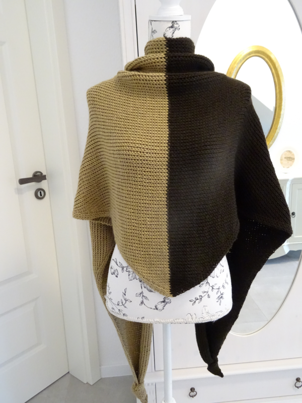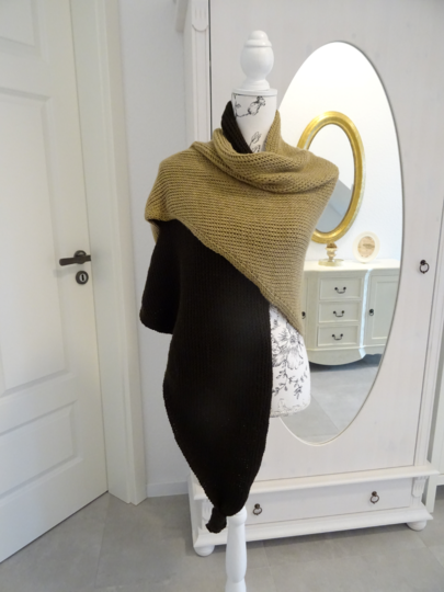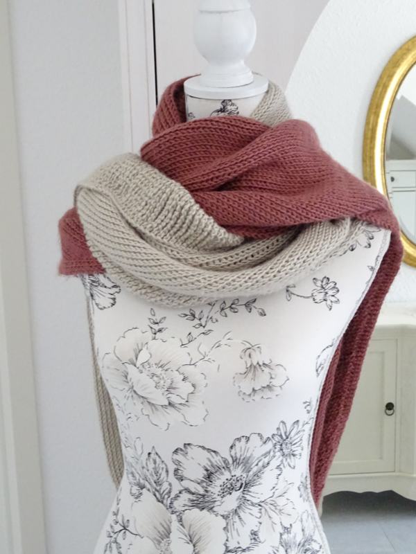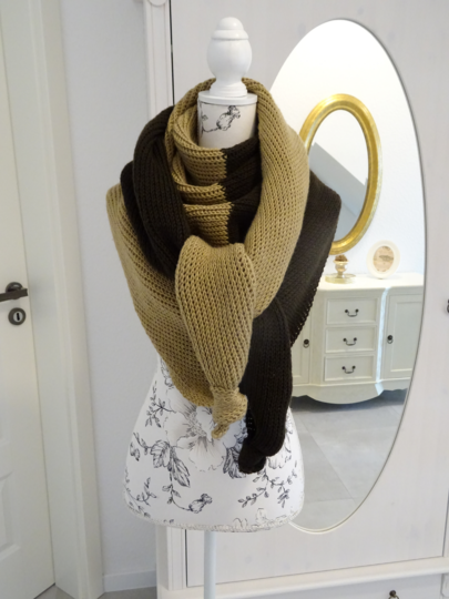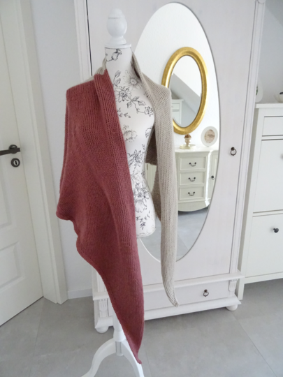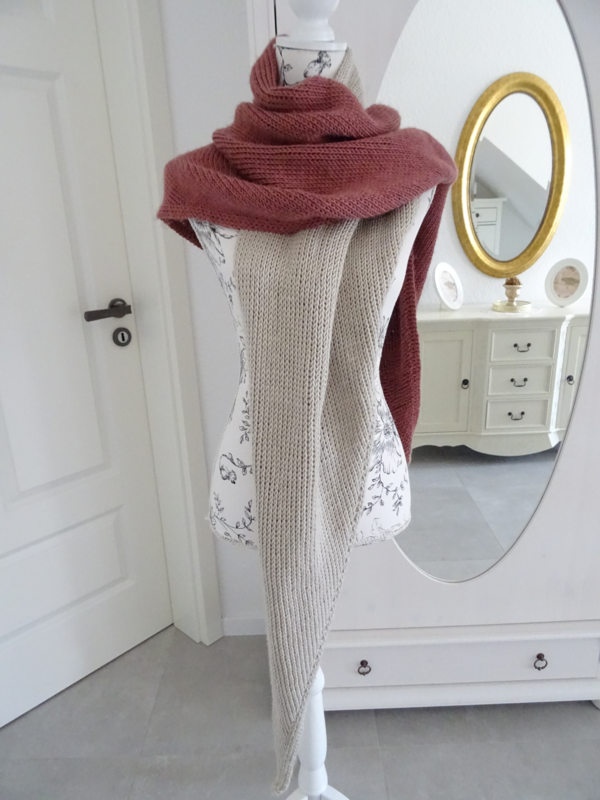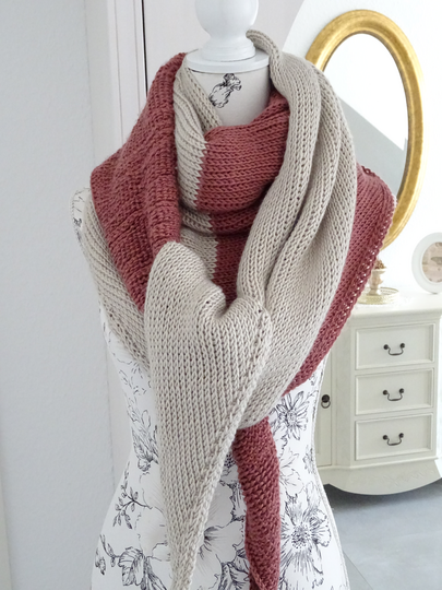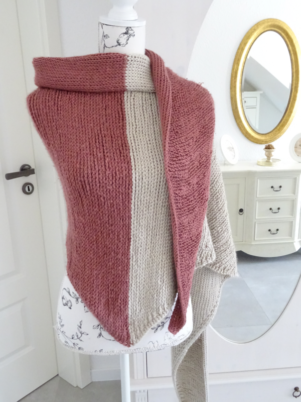 Es war meine Absicht, diese Kreation lediglich durch die Kombination der gut miteinander harmonierenden Farben Beere und Beige, als Farbvariante 1, bzw. Camel und Braun, als Farbvariante 2, wirken zu lassen und durch den dezenten seidigen Glanz des Garnes eine schlichte Eleganz zu erzeugen. Die dezente Musterung, auf der einen Seite ganz glatt und auf der anderen Seite strukturiert, bleibt dabei sehr schön im Hintergrund. Großzügig und anschmiegsam legt sich dieses Dreiecktuch um seine Trägerin und verwöhnt mit einem angenehmen Tragegefühl.