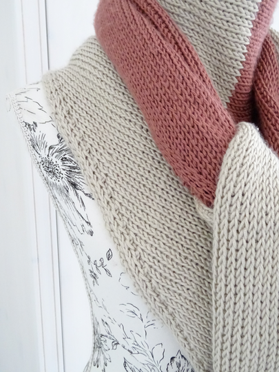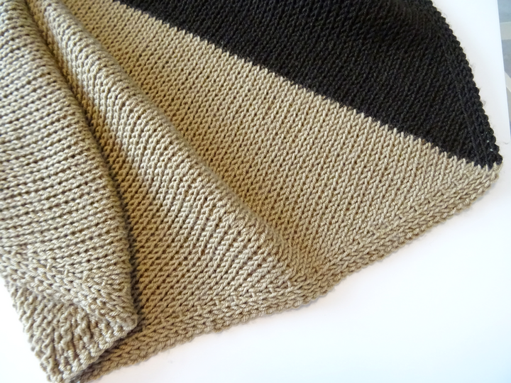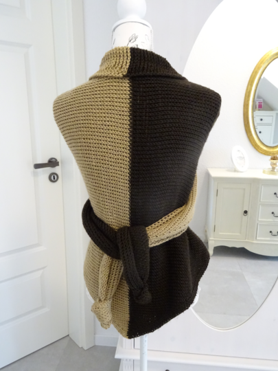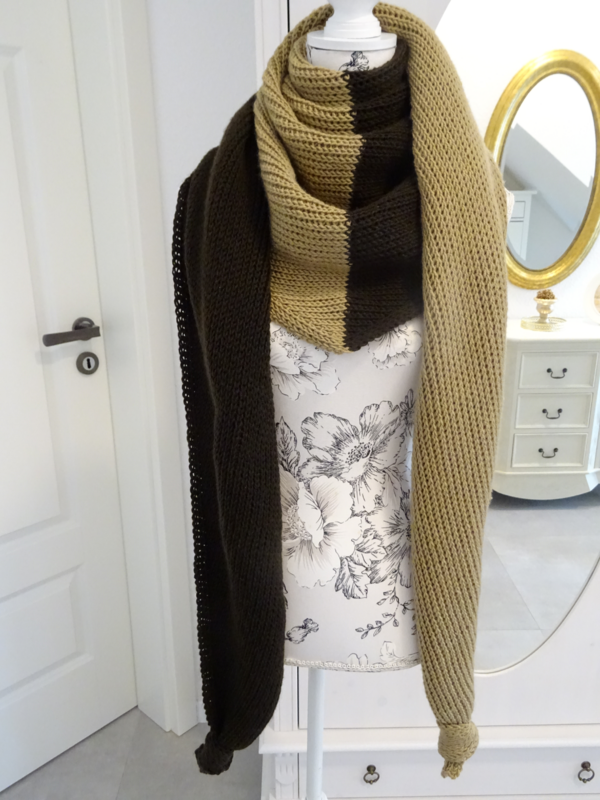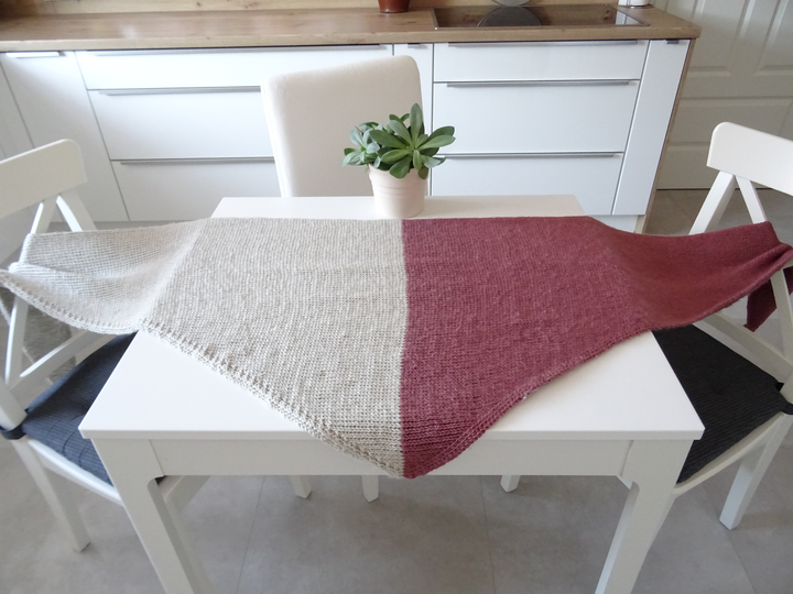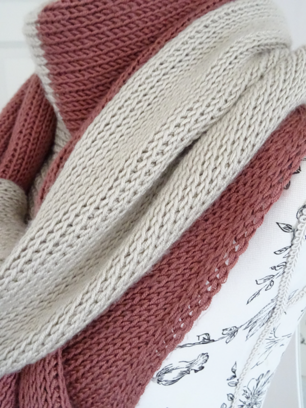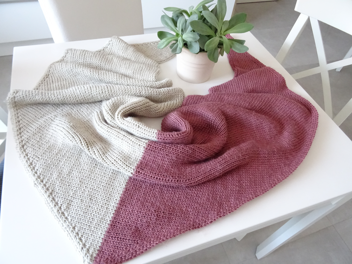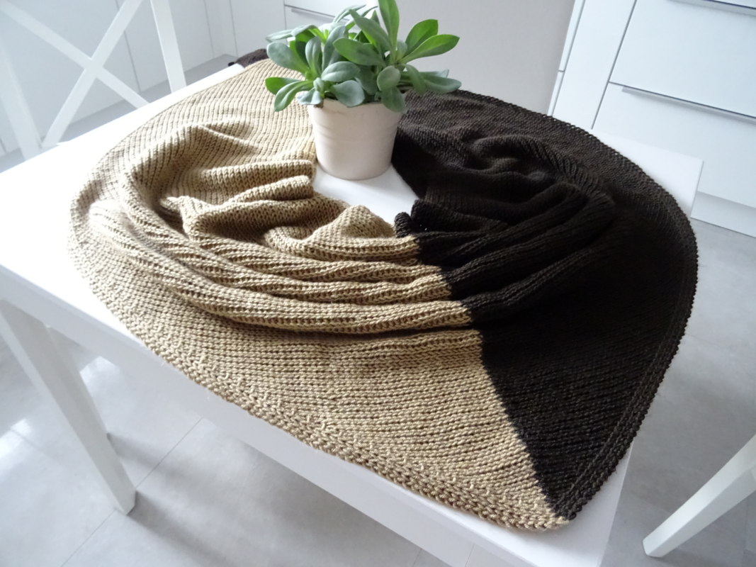 Es war meine Absicht, diese Kreation lediglich durch die Kombination der gut miteinander harmonierenden Farben Beere und Beige, als Farbvariante 1, bzw. Camel und Braun, als Farbvariante 2, wirken zu lassen und durch den dezenten seidigen Glanz des Garnes eine schlichte Eleganz zu erzeugen. Die dezente Musterung, auf der einen Seite ganz glatt und auf der anderen Seite strukturiert, bleibt dabei sehr schön im Hintergrund. Großzügig und anschmiegsam legt sich dieses Dreiecktuch um seine Trägerin und verwöhnt mit einem angenehmen Tragegefühl.