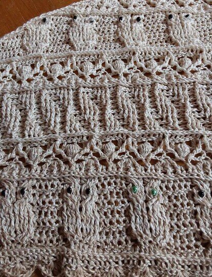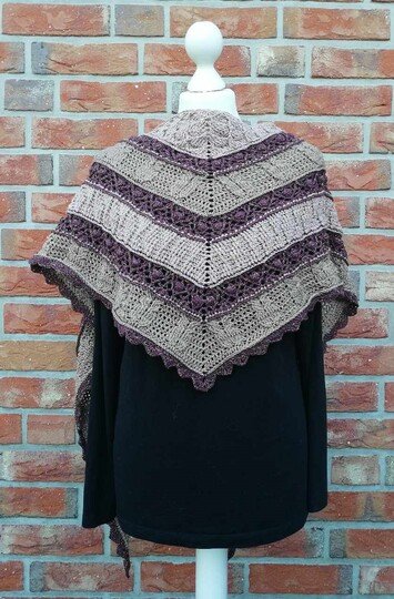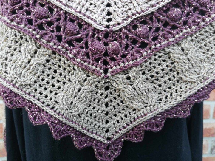 Das flache Dreieckstuch "Eunomia" besticht durch abwechslungsreiche Reliefmuster und lockere Zwischenmuster. Süße Eulen können entweder mit oder ohne Augen gehäkelt werden. Ein Blickfang, der nicht nur zu Halloween alle Augen auf sich ziehen wird!